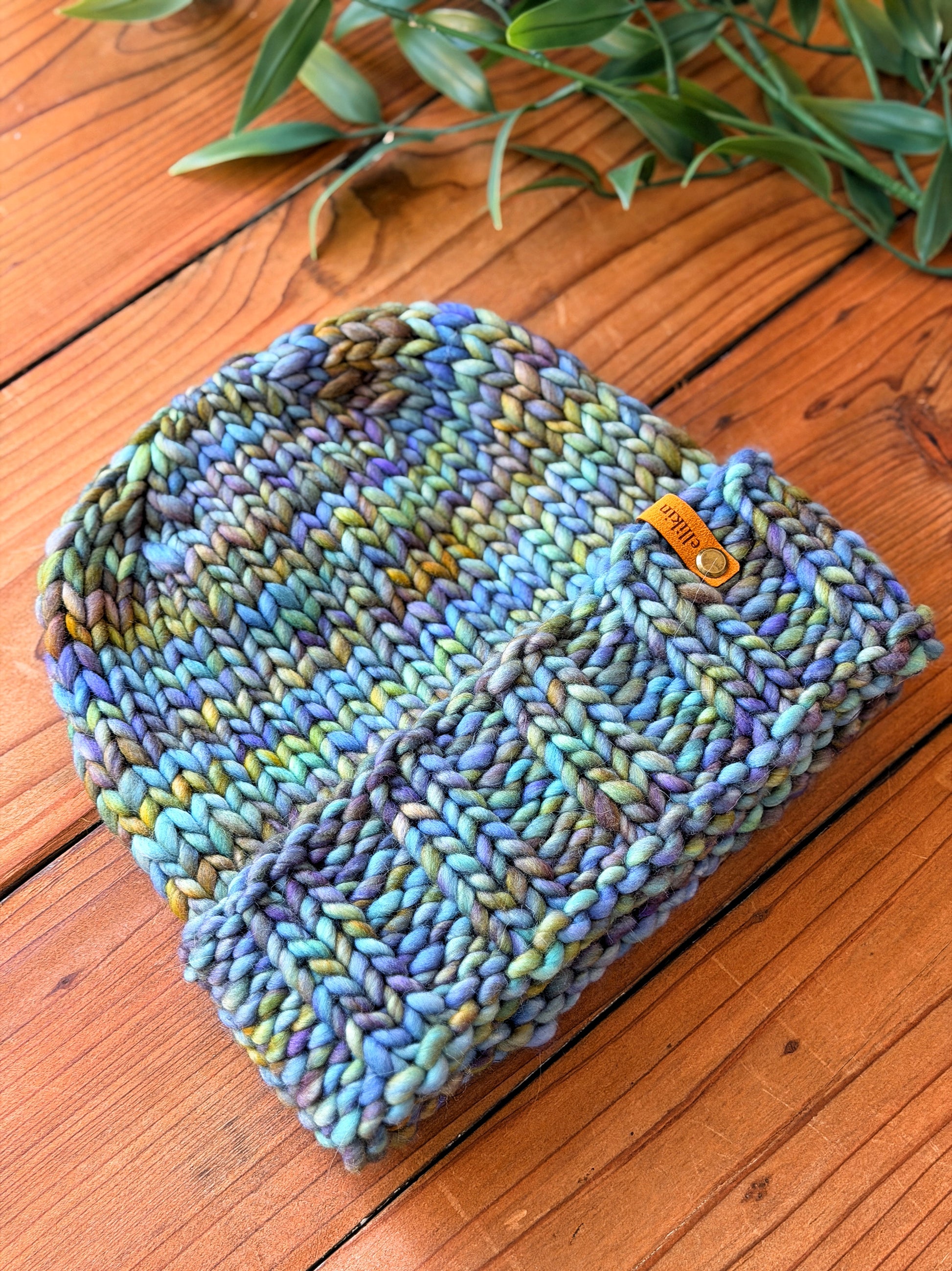 - Hand-knit with a hand dyed merino wool yarn